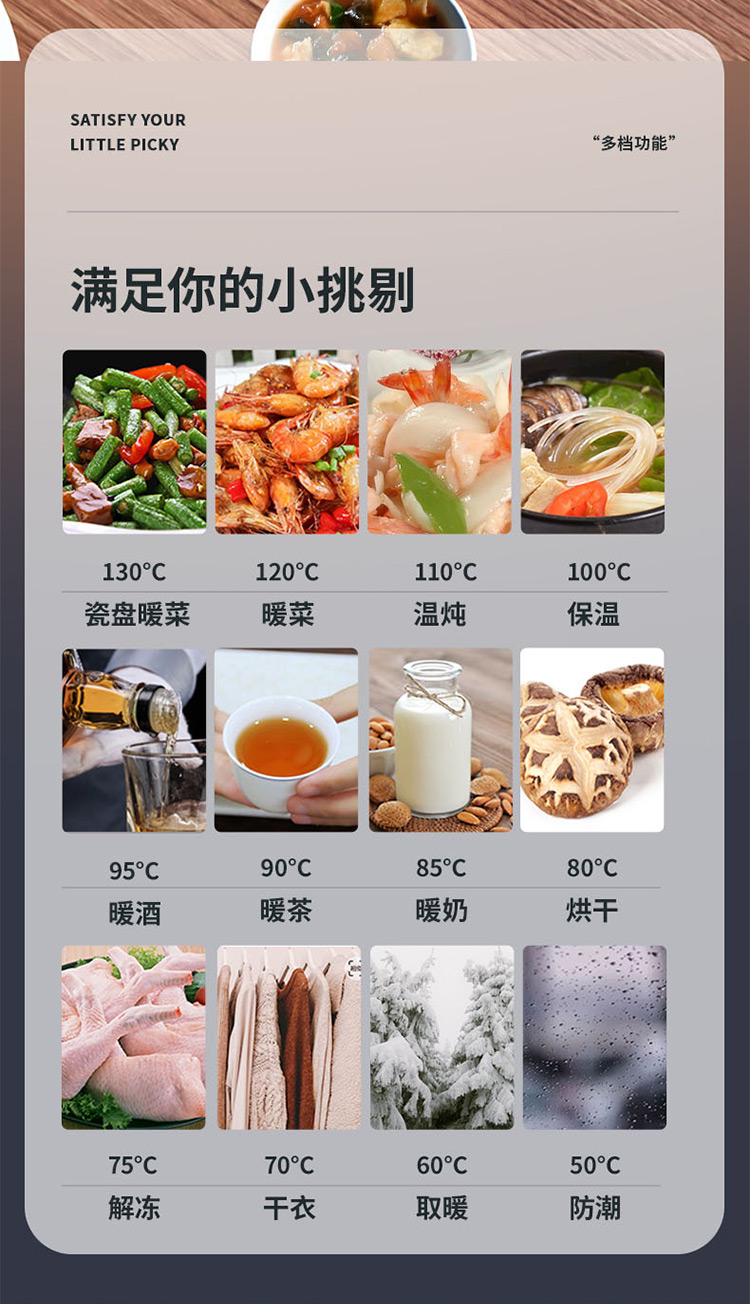 50℃-130℃多档温控/12大保温功能/定时预约/不挑餐具/耐高温面板/智能恒温/智能触屏/童锁设计